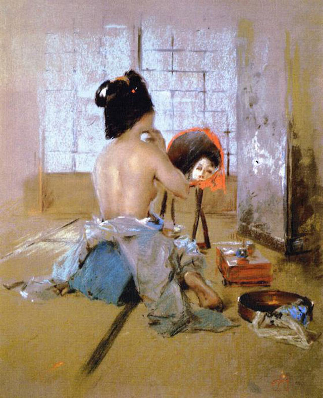 Năm 1876, trong một lần đến dự Triển lãm kỉ niệm 100 năm thành lập bang Philadelphia của Mỹ, Blum đã rất thích thú với văn hóa và hội họa của Đất nước mặt trời mọc. Cuối cùng, ông đã đặt chân lên Nhật Bản vào năm 1890 và ở lại đây trong 3 năm, và trong 3 năm đó, những tuyệt tác hiếm có về cuộc sống Nhật Bản thế kỉ 19 được tạo ra.