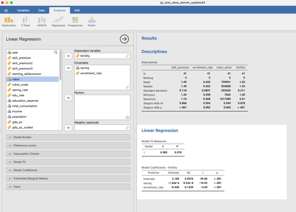 Phần mềm này mang đến cảm giác của Tableau. Cực kì thân thiện và trực quan. Bạn gần như không phải code gì hết, chỉ việc click chọn biến để hồi quy thôi. Phần mềm này cũng cho phép tạo các bảng biểu và hình vẽ luôn, chỉ việc copy kết quả.