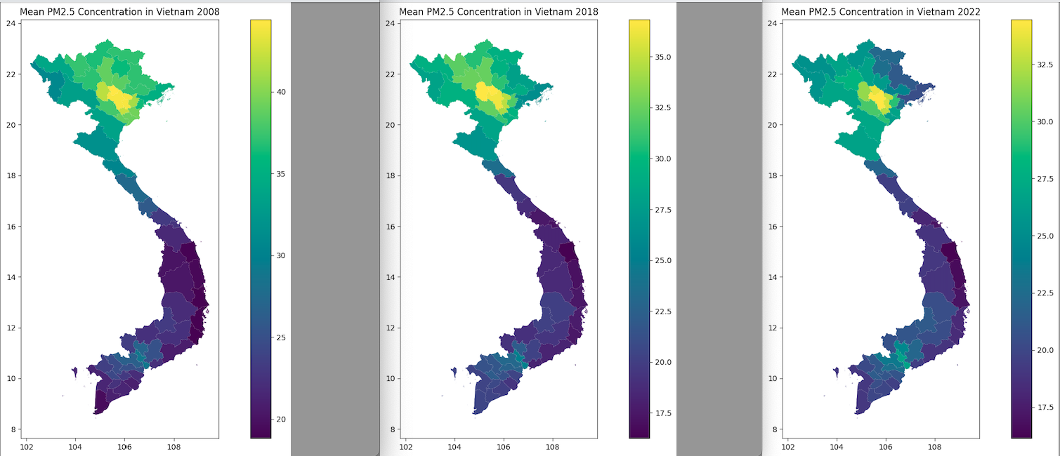 Ở đây mình lấy dữ liệu các năm 2008, 2018 và 2022. Nói chung chất lượng không khí ở VN luôn vượt mức cho phép của WHO (là không quá 5 µ/m3 một năm) nhưng có xu hướng giảm. Nơi ô nhiễm nặng nhất vẫn là Hà Nội và khu vực phía Bắc.